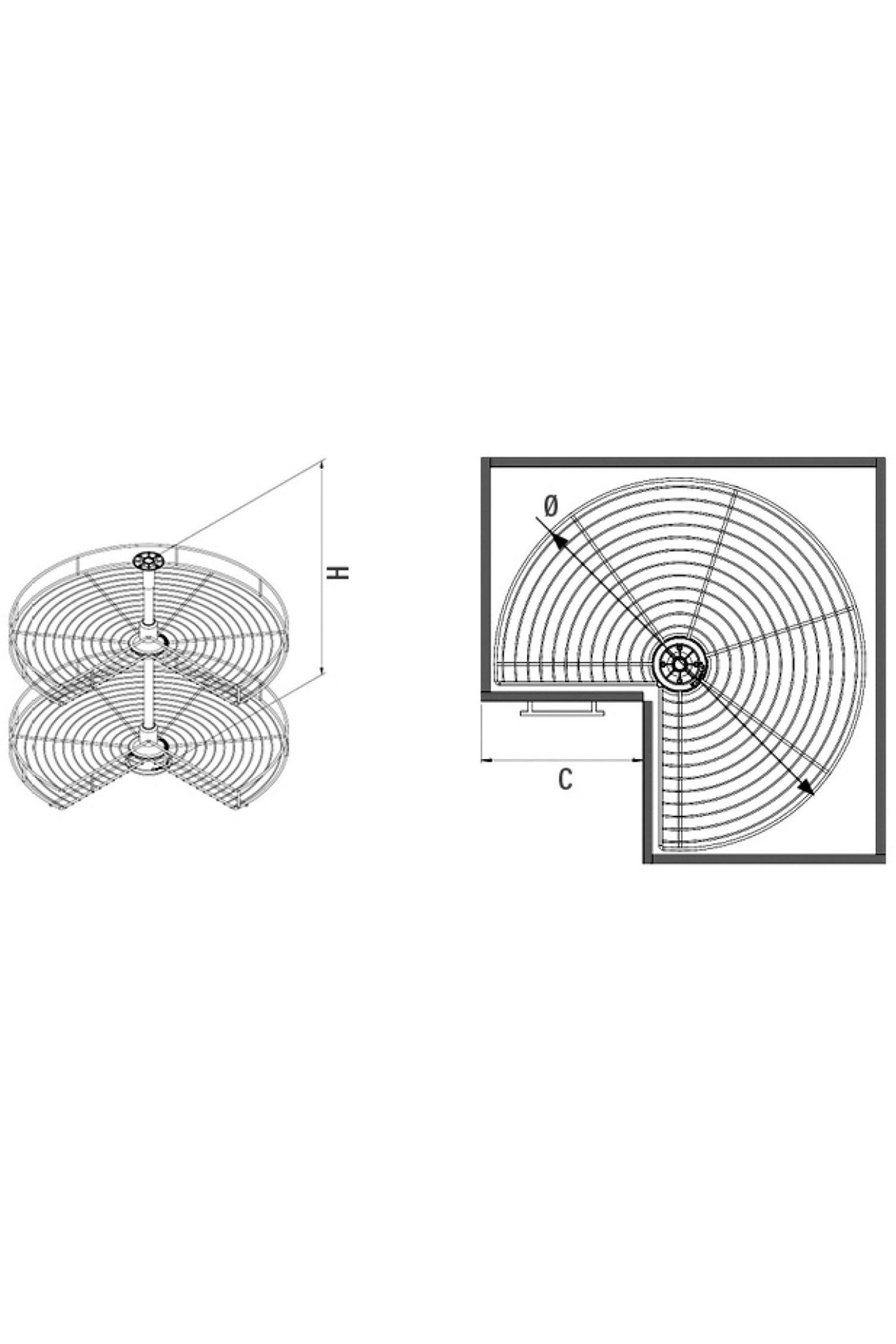 Ø x H(mm) : Ø 600 x 650 - 700 C (mm) : 280+280 Box : 1 Volume (m³) : 0,0772 Weight (kg) : 5,5000 Köşe dolaplarında, menteşeli iki kapak ile kullanıma uygundur. Taşıma kapasitesi her sepet için 30 kg dır. Alt sepet, taşıyıcı boru üzerinde tabanda, üst sepet ise istenen yükseklikte ortada sabitlenerek kullanılır. Taşıyıcı boru üzerinde 360° döndürülen sepetlerin her noktasına ulaşabilmek mümkündür. Sepetler 4 kademeli hareketle tam turunu tamamlar. her kademede stoplanır. Taşıyıcı boru dolap yüksekliğine uygun ayarlanabilir. Mekanizmada sepetler antrasit renk kaplamalı, taşıyıcı boru gri boyalıdır.